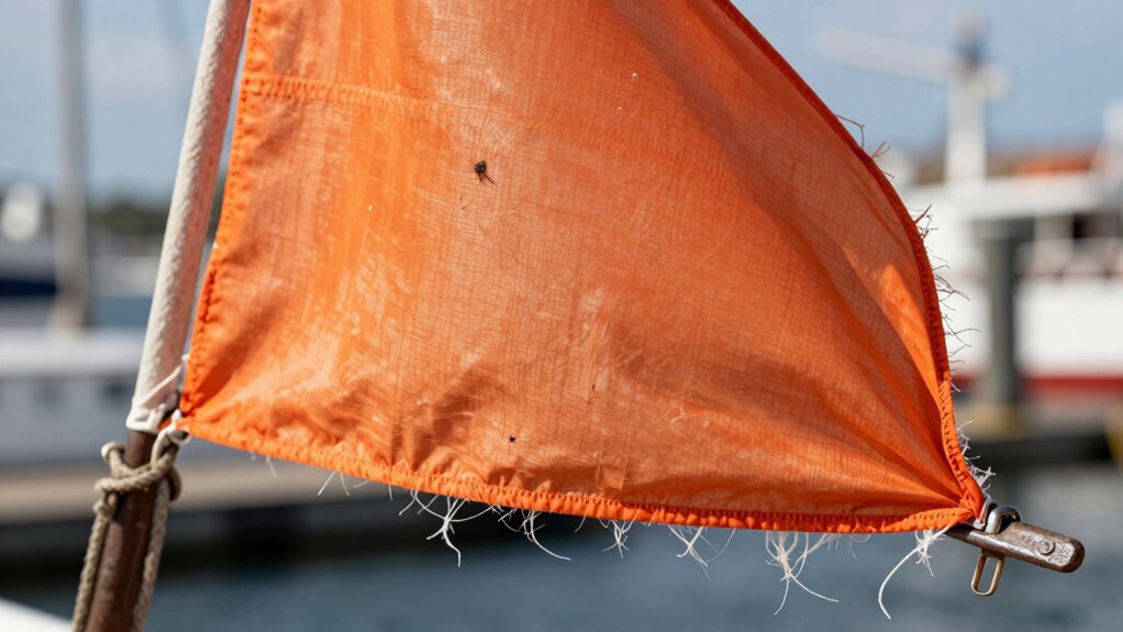 Environmental factors like marine debris and UV exposure can definitely accelerate pennant chafe. Marine debris can abrade the surface, weakening the material over time, while UV rays break down fibers, making them more prone to snapping. To prevent this, regularly inspect your pennants and store them in shaded, debris-free areas when not in use. Taking these steps helps extend their lifespan and guarantees reliable mooring.