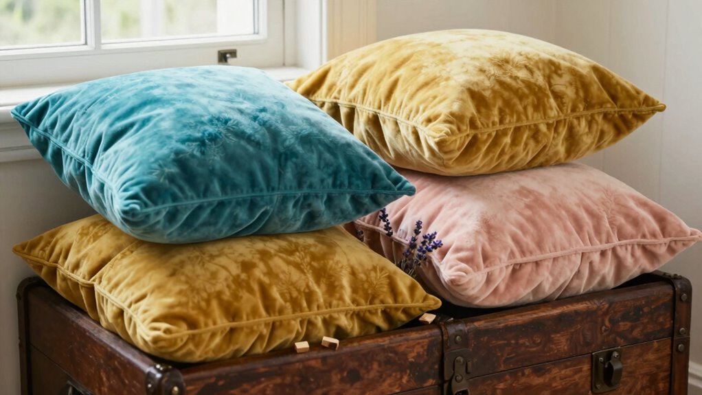To keep your cushions looking their best during storage, it’s essential to maintain their shape. One simple technique is to arrange your cushions in decorative pillow arrangements that prevent flattening. Avoid stacking them directly on top of each other, which can distort their form. Instead, place them upright or lean them against a wall or box for support. Consider cushion filling options that help retain shape, such as foam inserts or polyester fiberfill, which bounce back after compression. If your cushions have removable covers, keep the inserts inside to maintain their structure. Using tissue paper or bubble wrap around the filling can also help preserve their shape. These straightforward methods ensure your cushions stay plump and inviting until you’re ready to use them again.