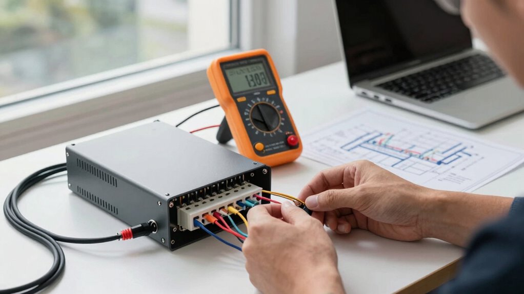 Regular testing and troubleshooting are essential to guarantee your power system operates reliably and safely. You should regularly check voltage regulation to ensure consistent power delivery, preventing fluctuations that could harm your electronics. Inspect surge suppression devices to confirm they’re functioning correctly and protecting against voltage spikes. Use a multimeter to verify connections and identify any loose wiring. Pay attention to signs of wear or corrosion that could compromise safety. Keep detailed logs of maintenance activities to track system performance over time. Regularly test your circuit breakers and fuses to avoid unexpected failures. Conduct periodic system audits to identify potential issues early. Remember, proactive maintenance ensures your power system remains efficient, reliable, and safe for your electronics.