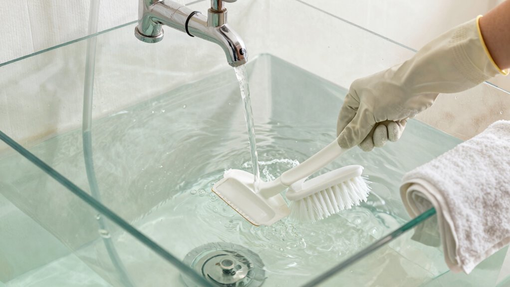Have you ever finished cleaning your tank only to notice lingering residues or streaks? Proper rinsing and drying are key to avoiding aftertaste. Start by thoroughly rinsing the tank with fresh water, making sure to remove any soap or cleaning solution. Next, wipe down surfaces with a clean, lint-free cloth to prevent streaks. While drying, check your filter maintenance; a clean filter ensures no residues are trapped. Afterward, allow the tank to air dry completely or use a dry cloth for quicker results. Before filling, perform water testing to confirm the water’s purity. Additionally, using natural filtration systems can help maintain water clarity and reduce chemical residues. Regularly inspecting filter indicators can prevent overuse and ensure optimal water quality. Incorporating proper cleaning techniques can also make a significant difference in avoiding aftertaste. Here’s a quick overview: