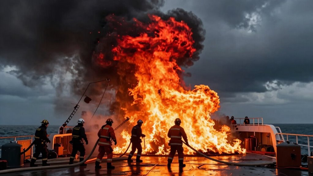 Noticing these signs prompts quick action, like activating fire suppression systems and signaling for help. Recognizing a fire visually is essential to prevent escalation. Always stay alert and monitor your surroundings for these indicators. When you see signs of fire, your prompt response can save lives and the vessel. Remember, effective emergency signaling and swift fire suppression are indispensable in controlling onboard fires.