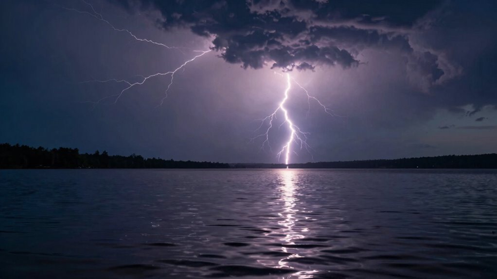 When lightning is detected nearby, take immediate action to protect yourself and others. Your first priority is to guarantee everyone is aware of the danger and moves to a safe location. Follow lightning safety protocols by seeking shelter indoors or inside a boat cabin, avoiding open areas and water. If you’re on the water, don’t attempt to navigate; stay put and reduce your risk of water emergencies. Keep away from metal objects, electronics, and tall structures that could attract lightning. Stay low and minimize contact with conductive surfaces. Remember, lightning can strike unexpectedly and travel through water, so quick, decisive action can prevent injuries. Staying calm and acting swiftly is essential to staying safe until the storm passes.
