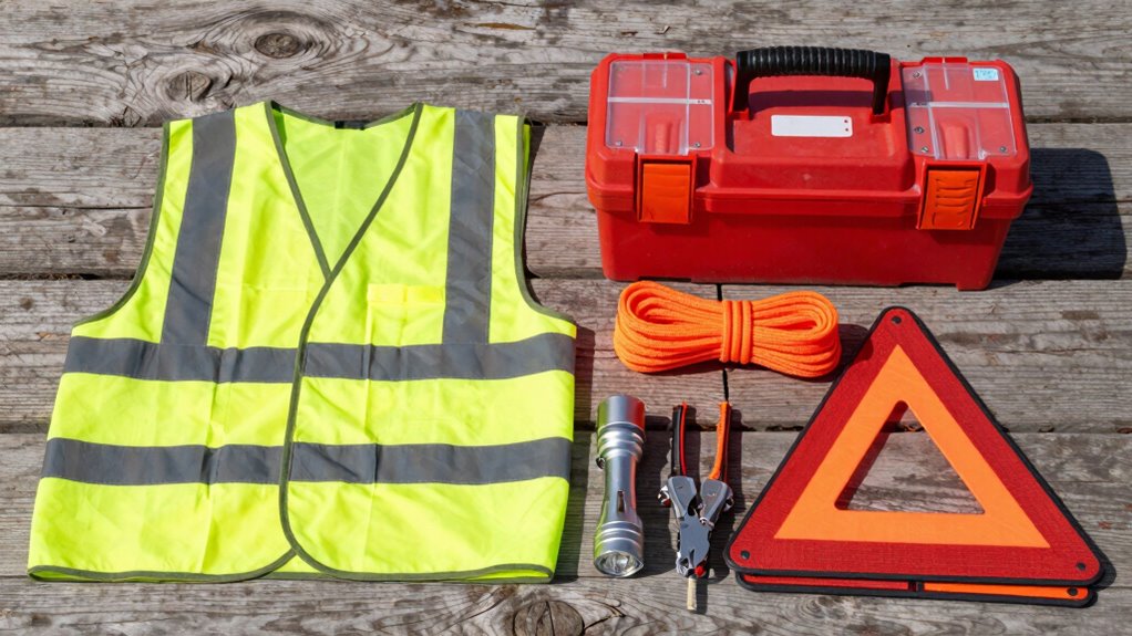 Accidents and mechanical failures can happen unexpectedly, so having a well-stocked first aid and safety kit readily accessible is vital. It helps you handle minor injuries and prevent further issues. Your kit should include items like bandages, antiseptic wipes, pain relievers, and gloves to promote injury prevention and comfort. Additionally, keep emergency contact numbers visible and accessible.