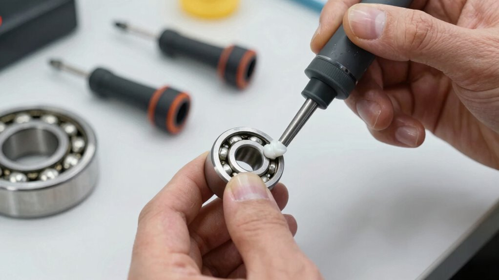 Before greasing, make sure you clean the bearings properly to remove dirt and old grease. Choose the right lubricant type to avoid seal damage and guarantee smooth operation. Handle the bearings carefully during maintenance to prevent any accidental harm to the seals.
