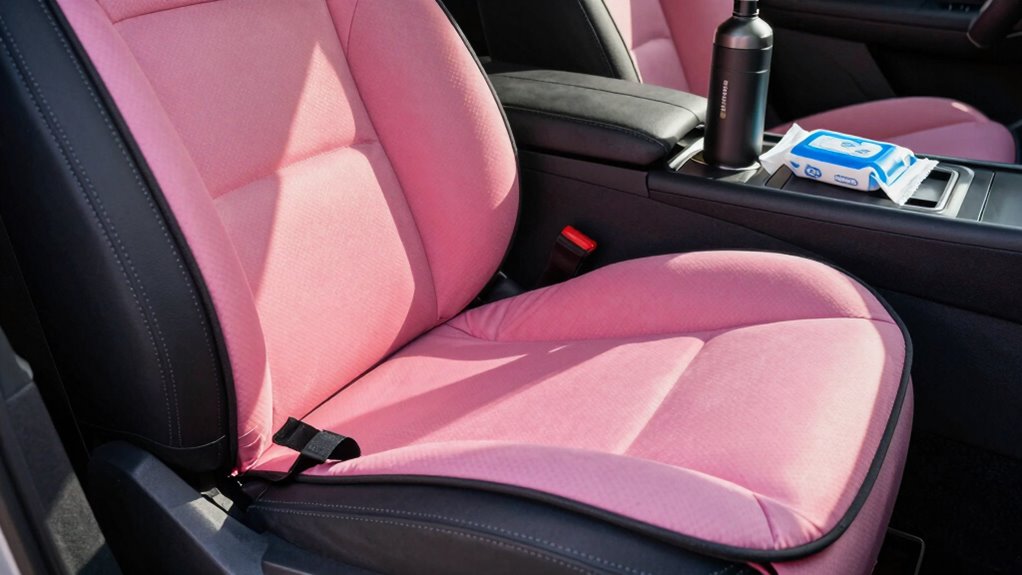 A proper fit for your seat covers and cushions can make a significant difference in preventing bunk rash during long drives. Guarantee your seat cover fit is snug, without being too tight or loose, to avoid unnecessary friction that can cause chafing. When selecting fabric, choose materials that are smooth and non-abrasive; fabrics like neoprene or padded vinyl can reduce skin irritation. Avoid loose or ill-fitting covers that shift and rub against your skin. A well-fitted cover stays in place, minimizing movement and friction during the ride. Pay attention to the fit around edges and seams, as these areas are more prone to causing bunk rash. Properly fitted covers and the right fabric selection help create a comfortable, friction-free surface for long-distance driving.