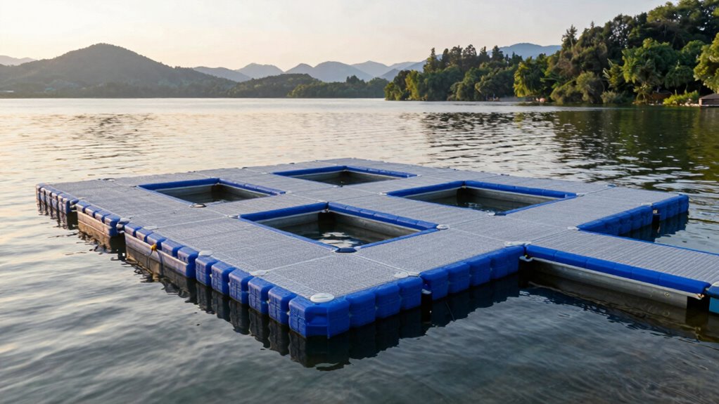 The top materials in heavy-duty floating dock kits include high-density polyethylene, treated wood like cedar or pressure-treated lumber, and marine-grade aluminum. I find polyethylene particularly durable and resistant to water damage, making it ideal for longevity. Marine-grade aluminum offers strength and corrosion resistance, perfect for supporting heavier loads. Treated wood provides a natural look and can be sturdy if properly maintained. These materials guarantee the dock holds up well over time.