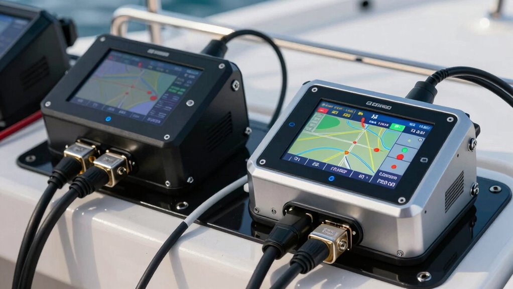 Autopilots connect seamlessly with your boat’s electronics through NMEA 2000 or NMEA 0183 networks. I simply install the compatible interface, then link the autopilot to existing GPS, depth sounders, and steering systems. This integration allows for smooth communication, automatic course adjustments, and precise navigation. I always double-check compatibility beforehand to guarantee everything communicates effectively, making my trips safer and more enjoyable.