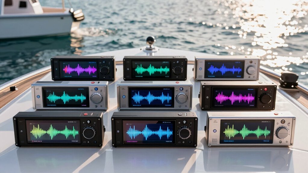Ever wondered how to get the best sound quality from your marine stereo head unit? The key is choosing one with high wattage output, ideally between 60 and 300 watts, for powerful, clear sound even in noisy marine environments. Features like equalizers, bass boost, and low-pass filters let you customize audio to your preferences and ambient conditions. Support for formats like FLAC, MP3, WMA, AAC, and WAV ensures better sound fidelity and more playback options. Preamp outputs (2-4 volts) allow connection to external amplifiers, boosting overall sound performance. Additionally, a weather-resistant, marine-grade build safeguards your system from moisture and corrosion, maintaining sound quality over time. These features help deliver crisp, personalized audio that enhances your marine experience.